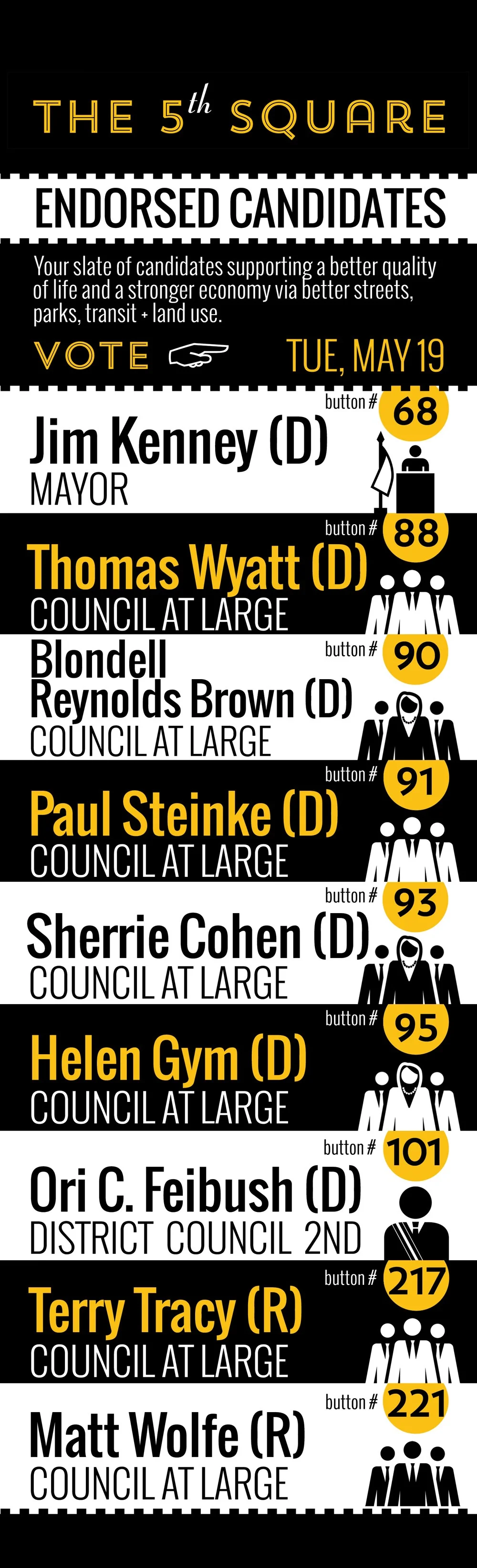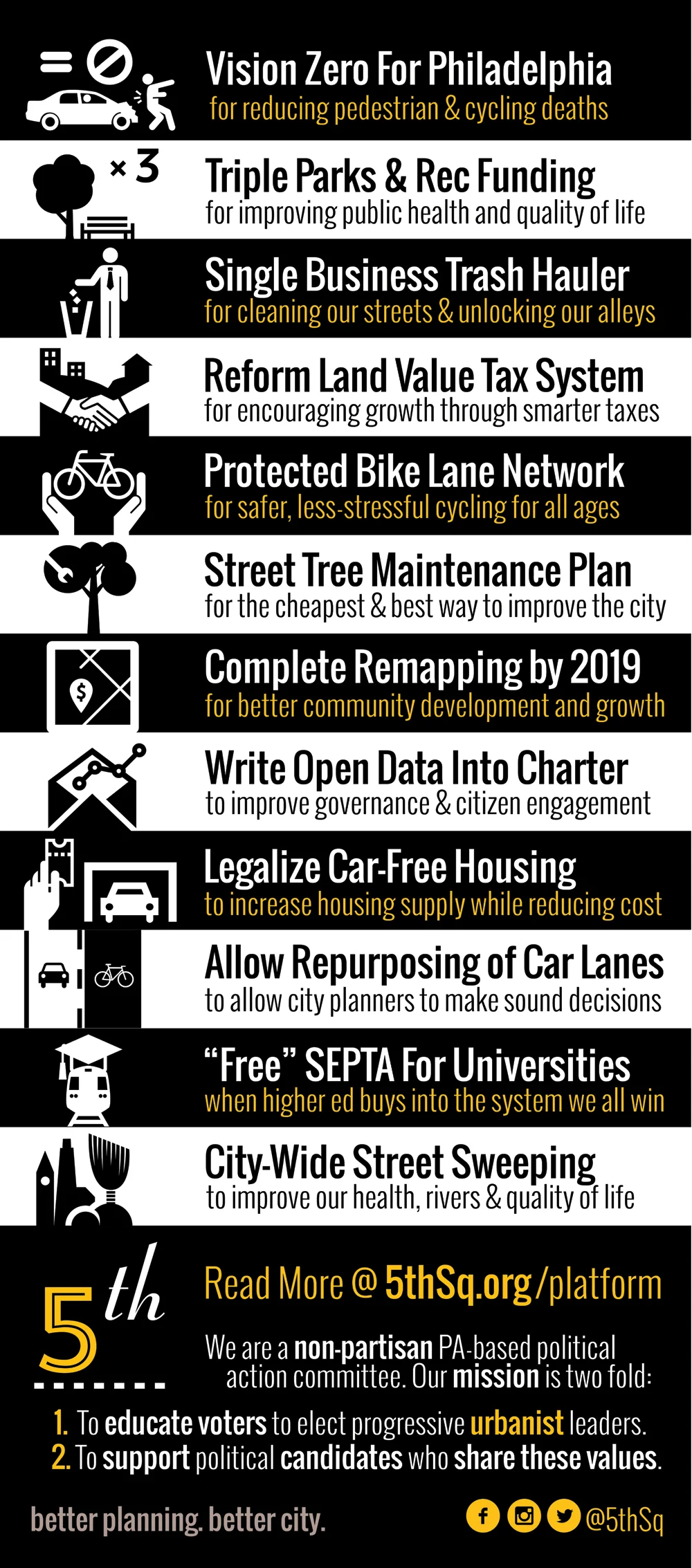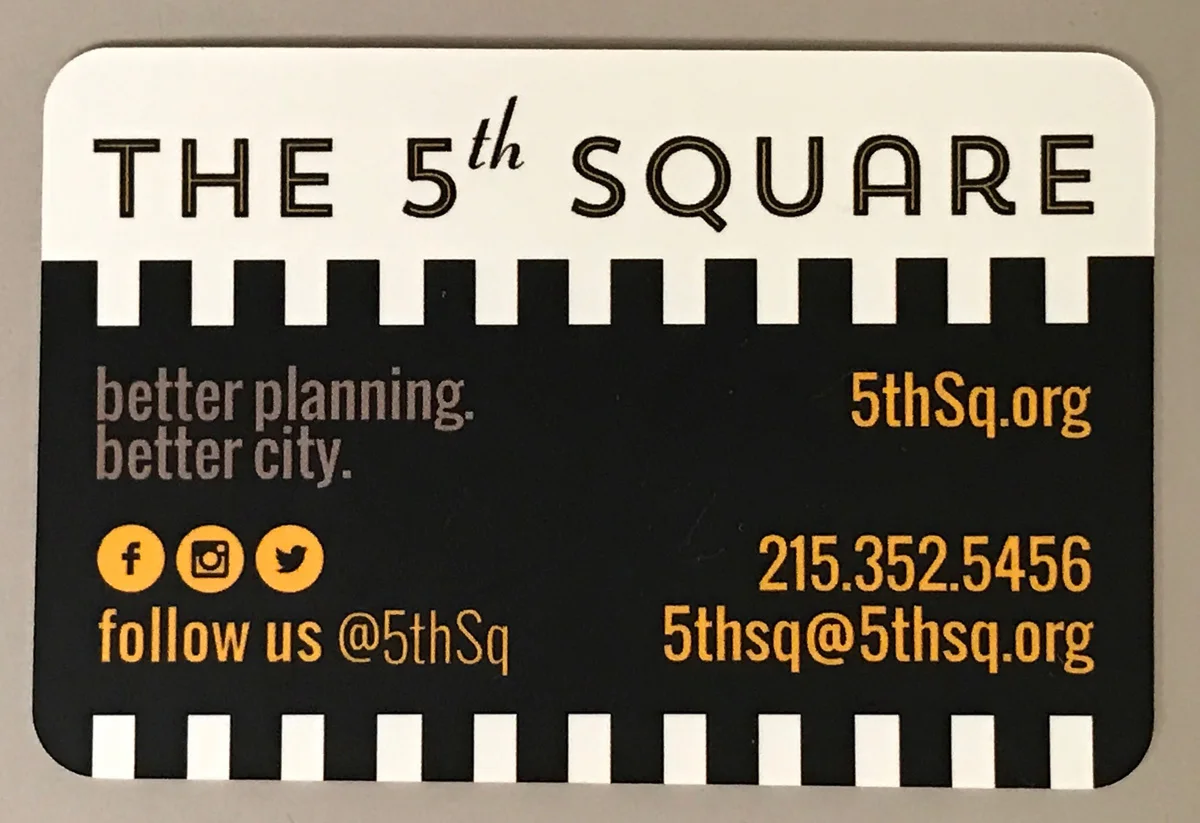As Co-founder and Chair of The 5th Square, one of my first tasks was to build a following for the organization by charging up support among our base constituency. Spoke Cards, so named because their size made them capable of being left in bike spokes, were used to tell the world who we are and what we stand for. Often the connection between local elections and good urban policy is not explicitly stated. As Philadelphia has experienced population growth due to net new migration into the city, we sought to tap into what this constituency wants: better public spaces, more responsive government, and safer traffic infrastructure.